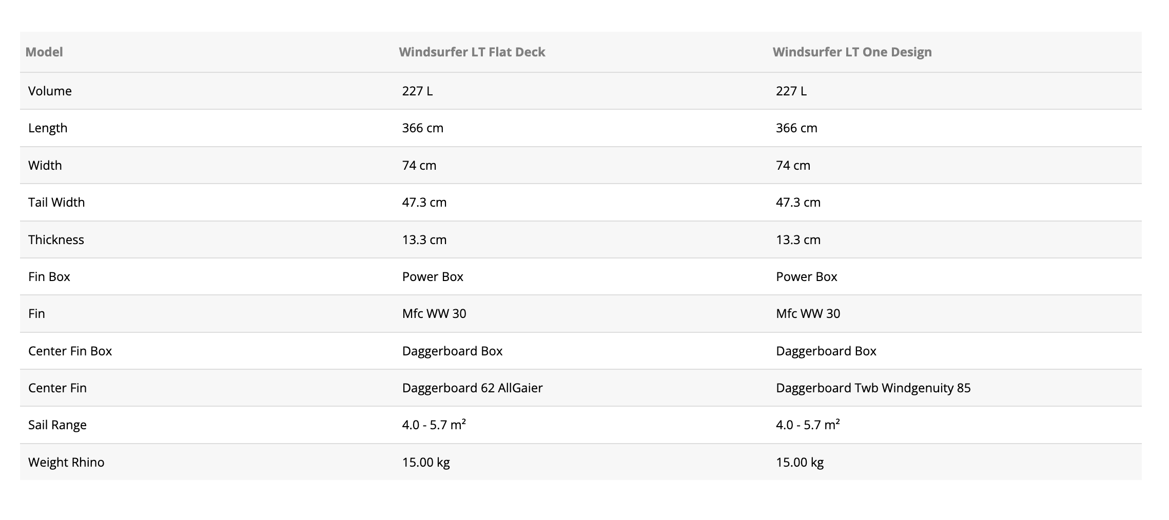 Windsurfer LT доступен в двух версиях. Версия «Один дизайн» поставляется с более широким и быстрым гоночным швертом, выступающим над палубой. Версия «Плоская палуба» поставляется с более узким швертом, который делает палубу плоской и свободной от лишних предметов.